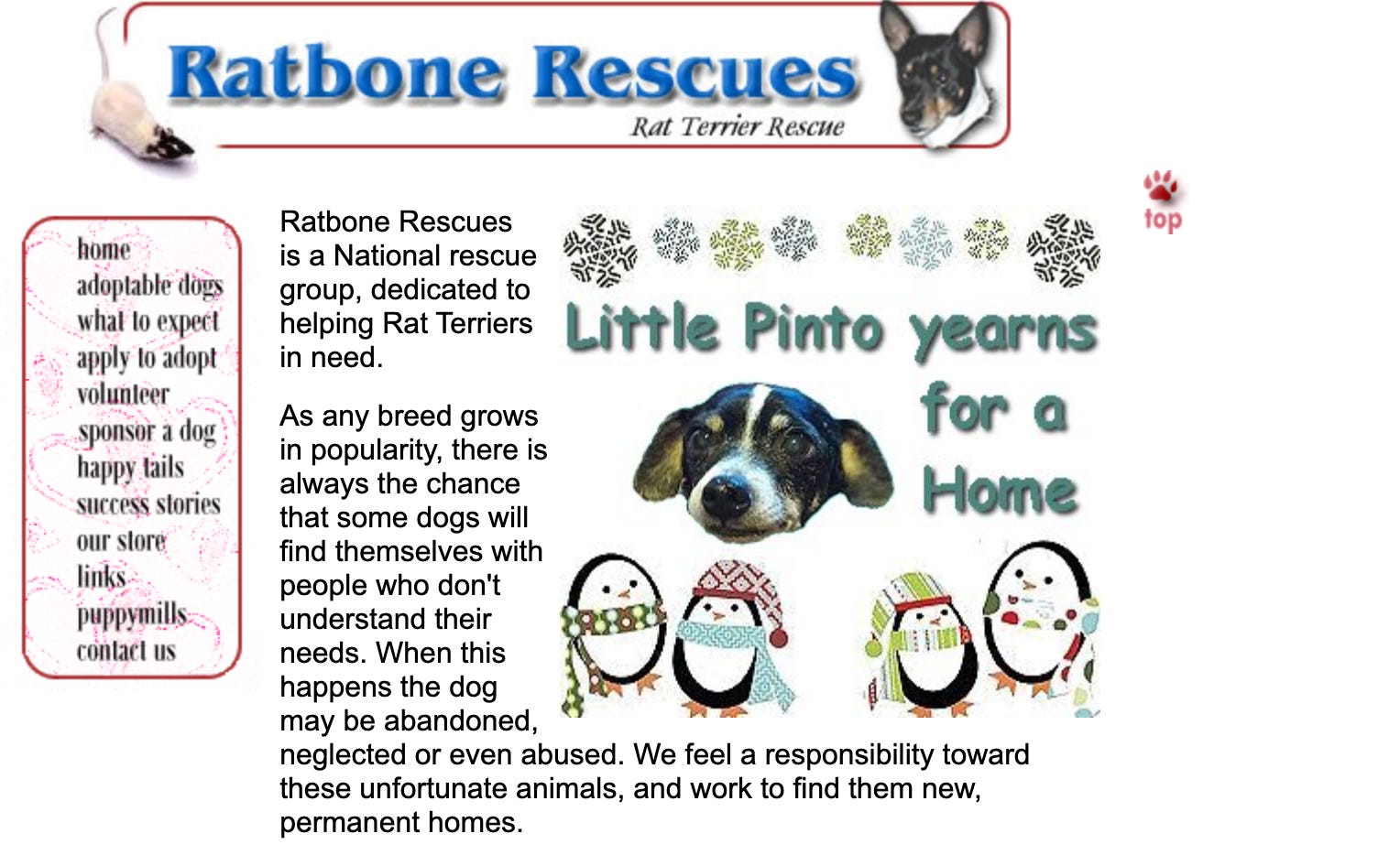 In researching solutions to my rat problem, I found myself on ratbonerescues.com, a Geocities-era website of a rat terrier rescue in Florida. Rat terriers are small dogs that were initially breed by farmers to catch rodents, and the menu bar on this website even has a little rat that appears as you hover!! This website brought up my very first memory of the internet—I was 6 or 7, in the children’s section of the Appleton Public Library. I logged onto a computer with my library card number and looked at a sherbet-colored, gif-ridden website about guinea pigs. And while it’s not practical for me to drive 24 hours due south to adopt another dog, I spent an hour reading this entire website. No AI!!
