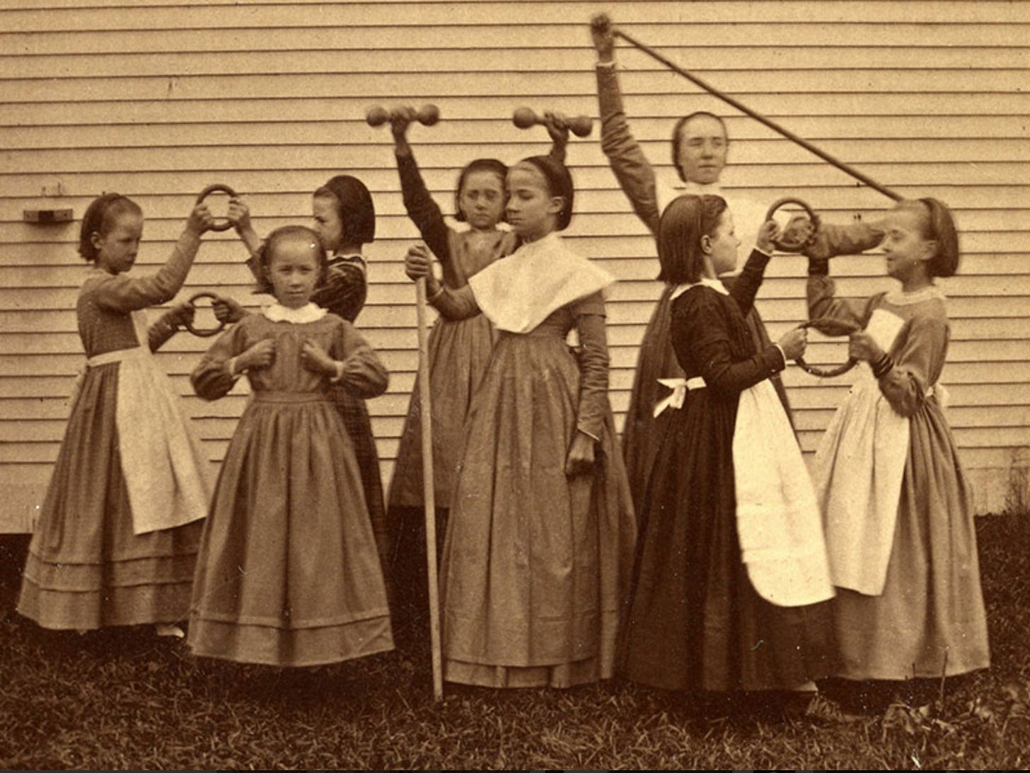 If you read this newsletter, you know I freaking love Shakers—a sect of Christians who live communally and don’t believe in sex or marriage. In the early to mid-1800s, there were an estimated 6,000 Shakers living in more than a dozen villages across the northeastern United States and as far west as Ohio. They were famous for their raucous worship services that included freeform dancing, singing, and speaking in tongues—though as they became wealthier and more established in the 19th century, their dancing became more choreographed and line dance-y with designated parts for men and women. The Shakers were total sickos for architecture, craftsmanship, and design, as evidenced by this next-level barn in Hancock, MA. They were the first people to sell garden seeds commercially, and invented items that we still depend on today like condensed milk, an early version of the washing machine, the buzz saw, and the flat broom (before the Shakers, brooms were round straw around a pole, cartoon witch style). They are probably most remembered for their minimalistic, eerily beautiful furniture.